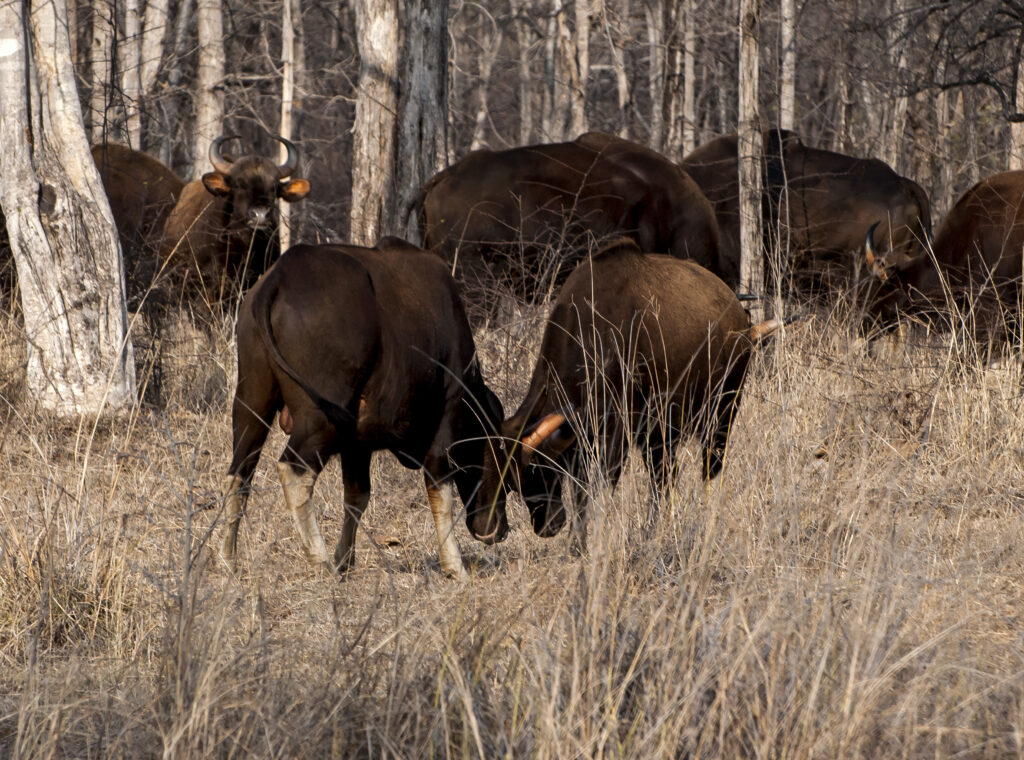 We rolled past sun-kissed meadows to stop to watch a herd of female gaur ( a large bovine, also called the Indian bison) that grazed while two male gaurs looked on possessively. Soon, a deep rutting sound, akin to a roar, reverberated across the forest. “This is mating season for the gaurs,” whispered our forest guide. The two male gaurs had sensed competition from two other males that were hanging around in the distance. The rutting sound, essentially mating calls, seemed to shake the very earth and sent chills down our spines. The females seemed unconcerned but the males, a 1,000 kg mass of muscle and power, exuded menace.